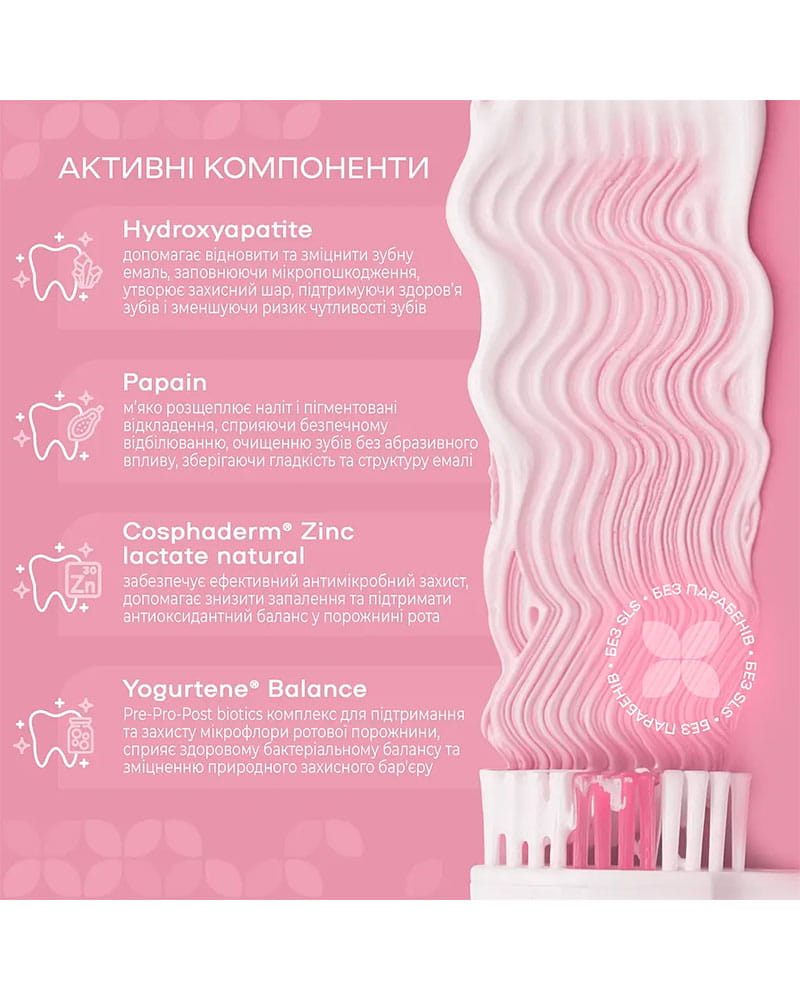Завдяки гідроксиапатиту паста допомагає заповнювати мікропошкодження емалі, роблячи зуби гладшими й міцнішими. Фермент папаїн м’яко розщеплює наліт та пігментовані відкладення від кави, чаю та їжі, не пошкоджуючи поверхню зубів. Цинковий лактат і комплекс пре-, про- та постбіотиків підтримують здоровий мікробіом ротової порожнини та запобігають неприємному запаху.
