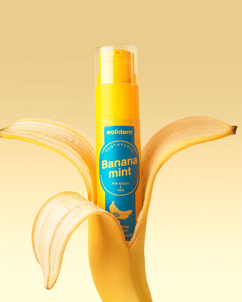 Зубна паста Solident Banana Mint з фтором 1450 ppm та гідроксиапатитом кальцію. Делікатне очищення, захист емалі та приємний смак.
